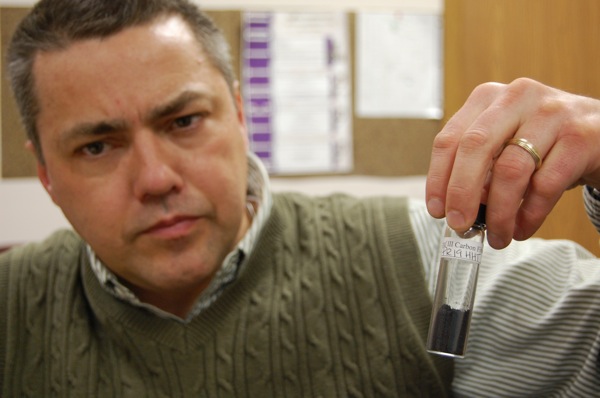 John McKay, Communications Director at Applied Sciences, holds a vial of carbon nanofibers, the key to making batteries more efficient.