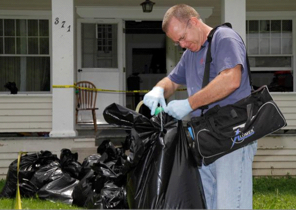 Joel Hogue tests mercury vapor in bags containing clothes removed from the Moore family home. Some bags tested around 100 times the limit considered safe. Photo by Barbara J. Perenic, courtesy of the Springfield-News Sun.