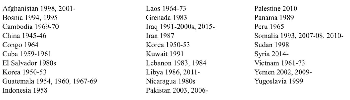 The value we get out of the war machine isn’t what you might think. China, the next-largest spender, pays for one tenth what we do. Even if we spent only what China spends, we’d almost certainly face no challengers, given our network of allies. For its part, China hasn’t bombed anyone in 80 years. In that time, we’ve bombed 28 countries. If you’re curious about the devastation we’ve wrought, read “The Jakarta Method.”