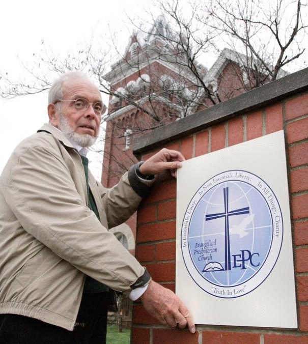 An elder at a Presbyterian church shows off the sign he had printed — with the logo of the denomination his church just joined. The denomination they left had founded the church more than a century before. Photo by Barbara Perenic, used courtesy of the Springfield News-Sun.