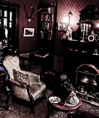 The interior of the Sherlock Holmes Museum on Baker Street. In the Victorian style, it's cluttered with stuff. (Creative Commons-licensed photo from the Flickr account of practicalowl)